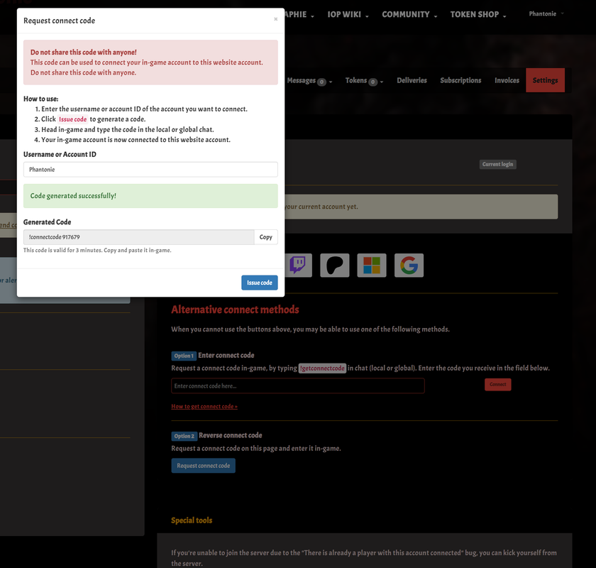 - Generiere einen Connect Code über den 'Request connect code' Button bei: Option 2 Reverse connect code indem du einen der Profilnamen oder Ids die du in deinem Spielerprofil Verlinkt hast nutzt.