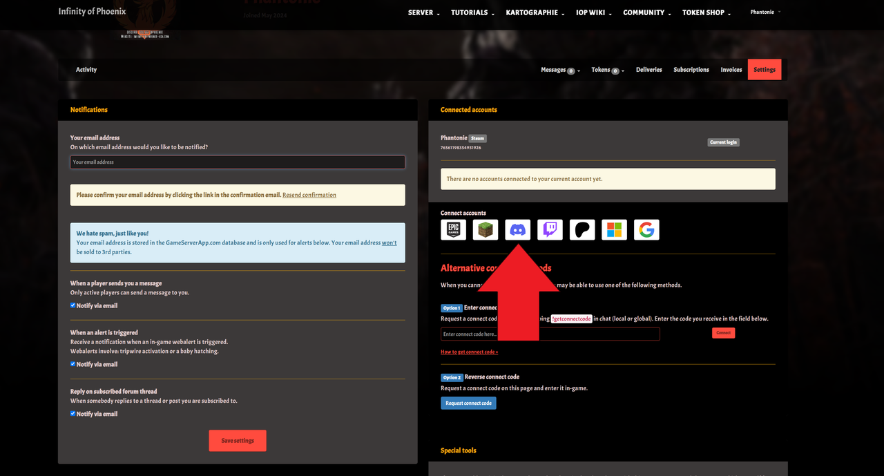 Info: Ob du dich mit Steam oder Discord bereits auf der Website registriert hast, spielt keine Rolle. Sobald ein Steam oder Discord Account in deinem Profil als "Current Login" oder "Connected" aufgeführt ist, ist dieser Verlinkt.